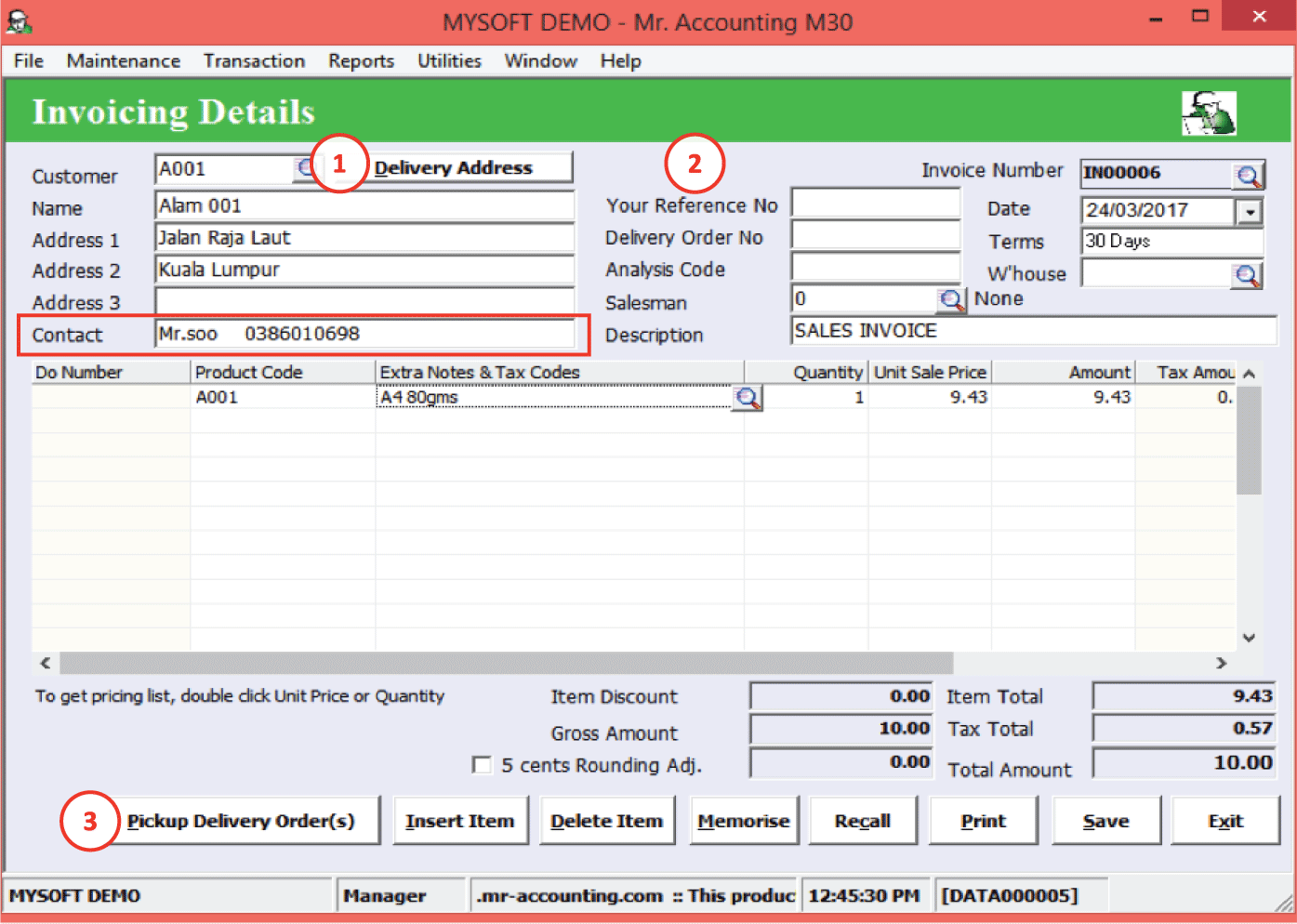 Note: The Contact field in Issue Invoice [in red box] picks up the Contact Person name and the Contact Person Phone No, whereas this field in Issue Delivery Order picks up the Contact Person name and Customer Phone No [see below]